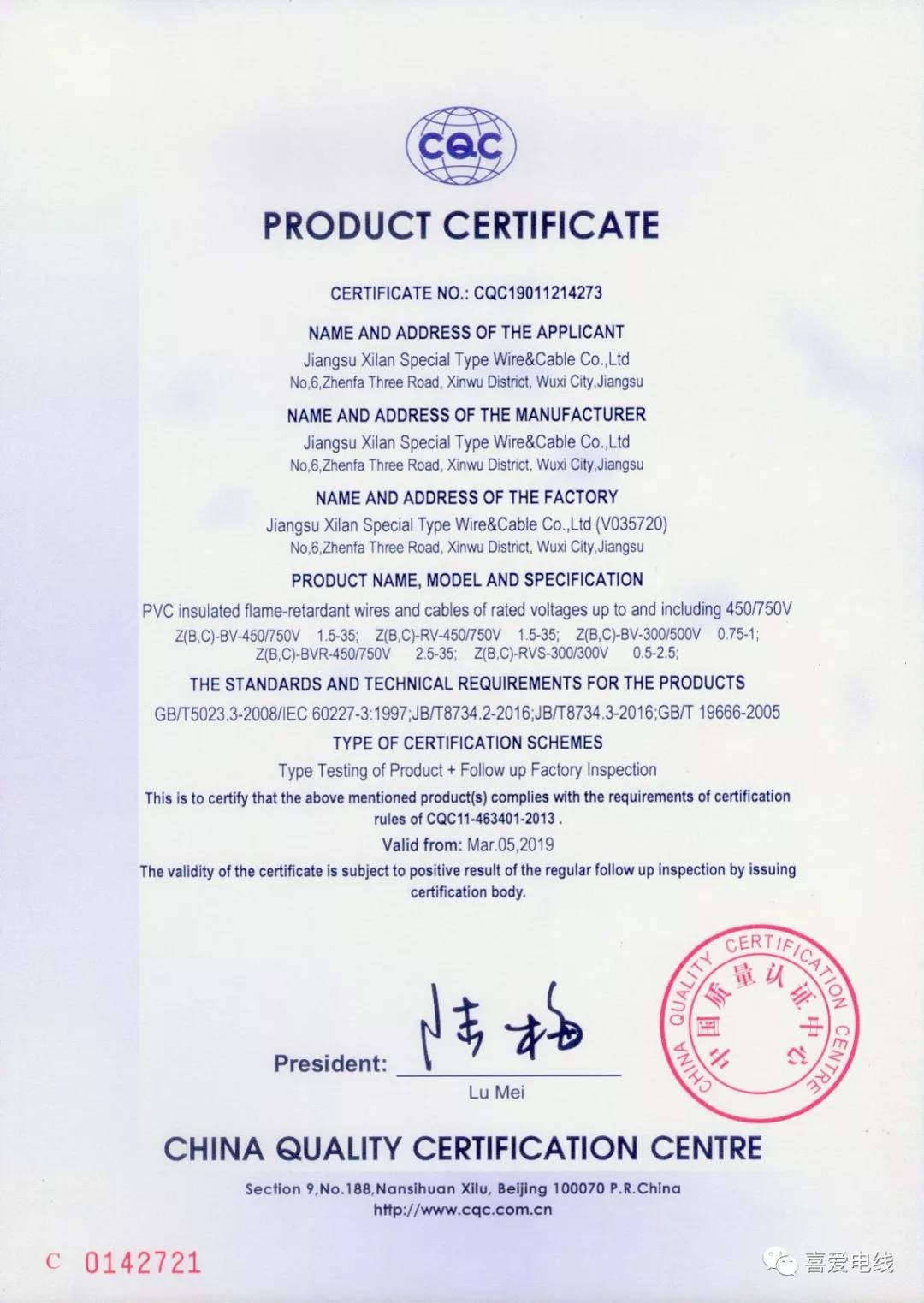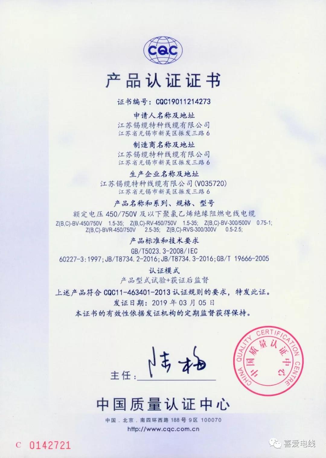 阻燃電纜電線產(chǎn)品認(rèn)證證書:
