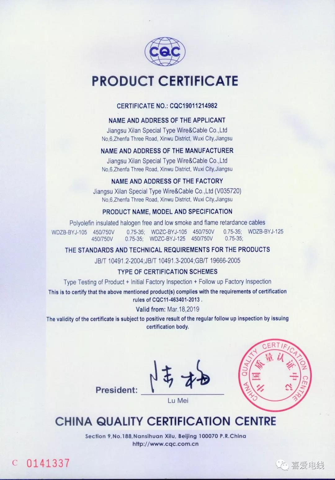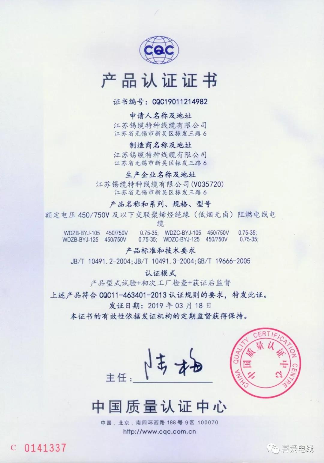 低煙無鹵電纜電線產(chǎn)品認(rèn)證證書: